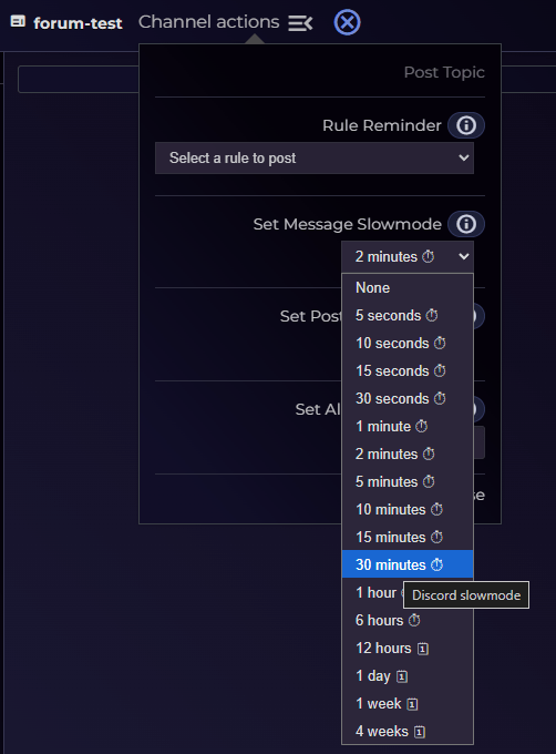 - Slowmode durations greater than 6 hours are enforced by the Bot. Shorter slowmodes are enforced by Discord. Changing short slowmodes on Forum channels may not apply to posts that were created before the slowmode was changed, due to the way Discord enforces slowmodes.
