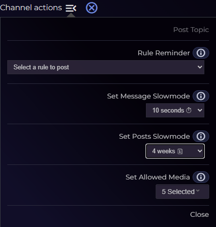 Authorized Bot users may set a forum channel’s post slowmode by selecting Set Posts Slowmode from the channel actions menu in the Bot UI.