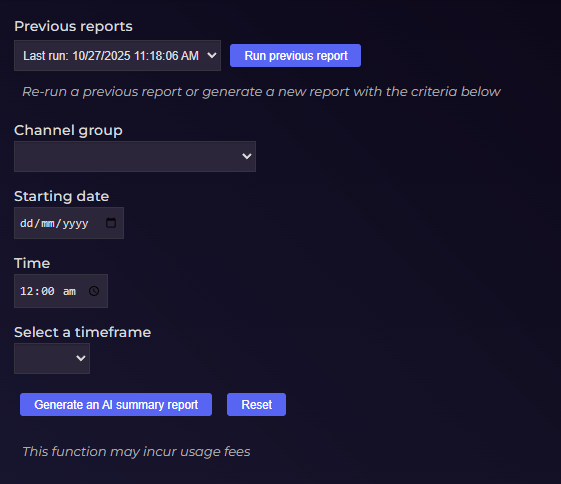 Generate an AI summary of the selected channel group within the specified timeframe, if this feature is enabled in your Bot package.